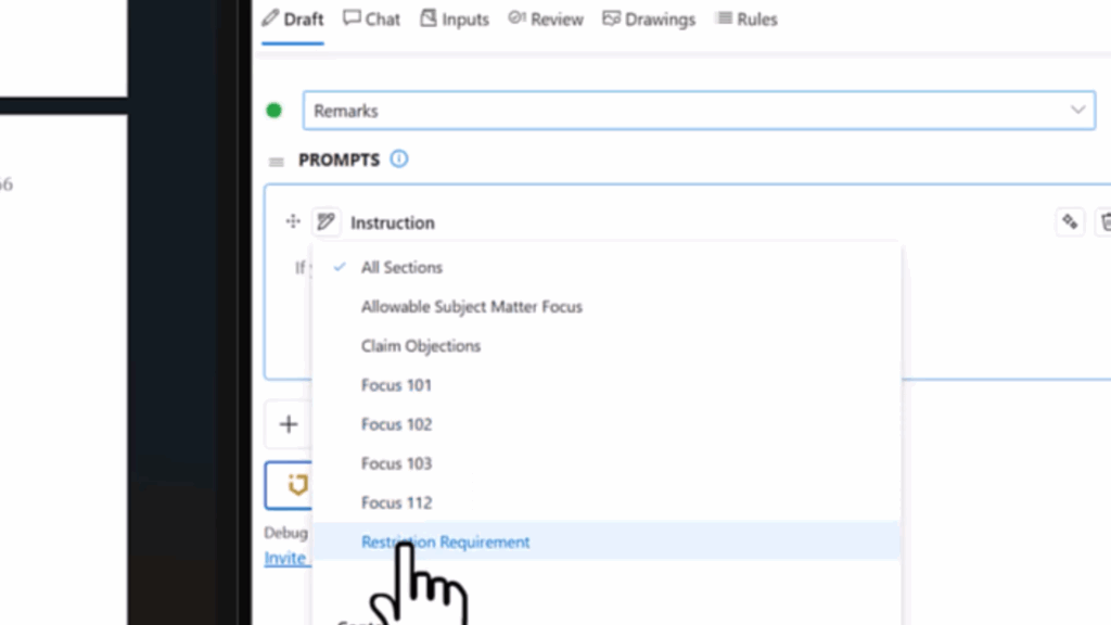 Junior supports a structured Draft tab workflow. As you move through your Office Action response section by section, Junior generates context-aware draft language aligned to the specific rejections and claim mappings, directly within your document.